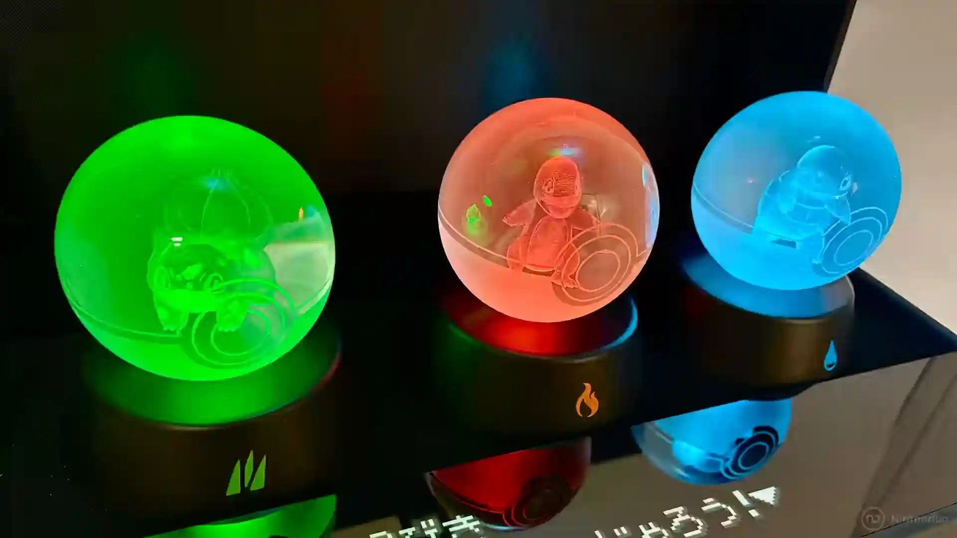 - Expositor con 3 Poké Ball de cristal tintadas de color con Charmander, Squirtle y Bulbasaur.