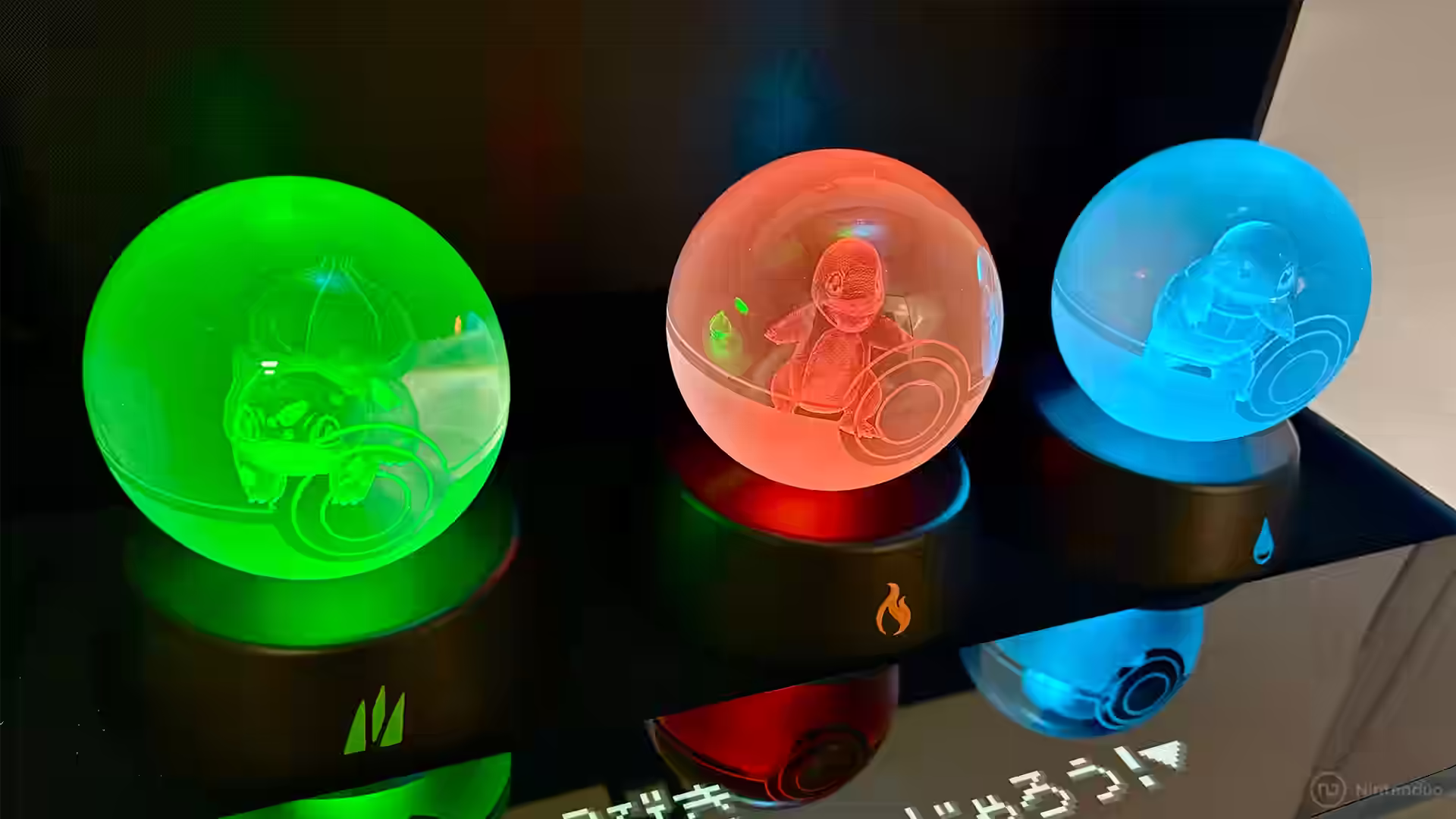 - Expositor con 3 Poké Ball de cristal tintadas de color con Charmander, Squirtle y Bulbasaur.