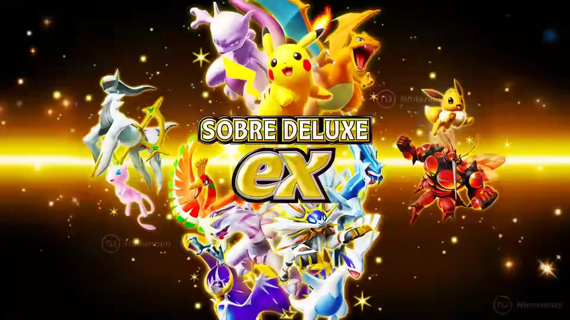Collage promocional del sobre Deluxe EX de Pokémon TCG Pocket con Pikachu, Mewtwo, Arceus y otros Pokémon legendarios rodeando el logo sobre un fondo negro con destellos dorados.
